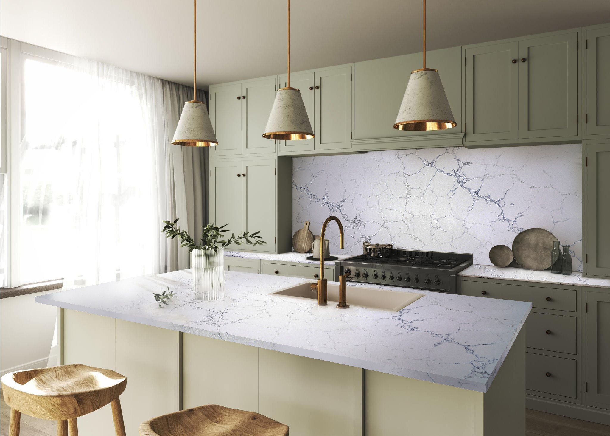 Calacatta Bluescape introduces a fresh dimension to design with its quartz slab featuring a pure white base adorned by dominant blue Calacatta veins. The striking blue hues seamlessly blend with accents of gold and subtle grey veins, creating a mesmerizing interplay of colors. Calacatta Bluescape transcends traditional design boundaries, offering a modern interpretation of classic elegance. Ideal for kitchens, bathrooms, or accent surfaces, this quartz slab transforms interiors into vibrant canvases, where the calming blues, radiant gold, and understated greys converge in a harmonious visual spectacle.