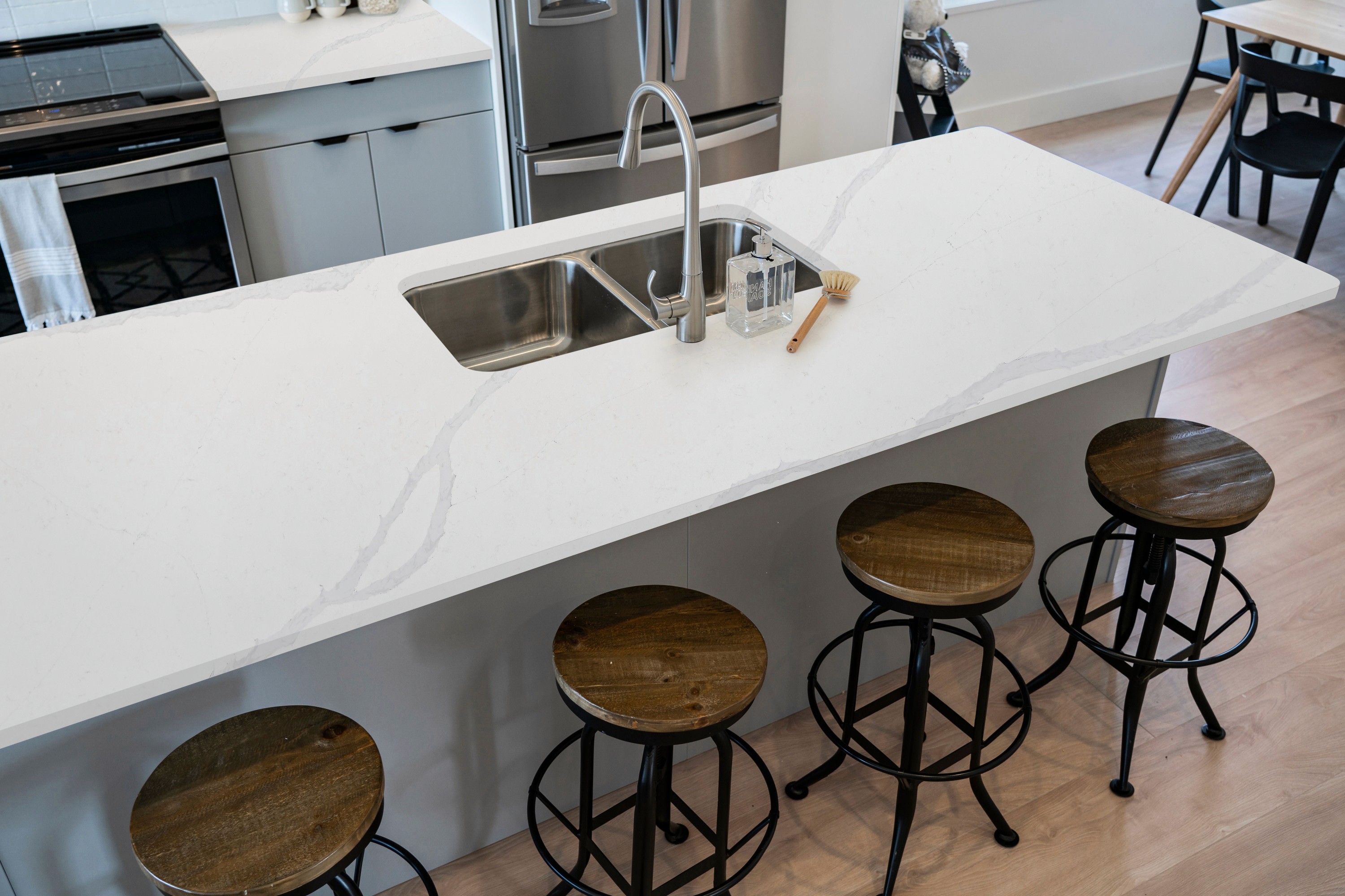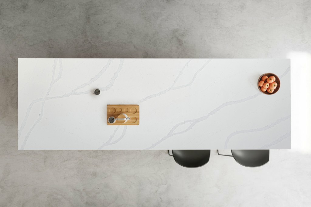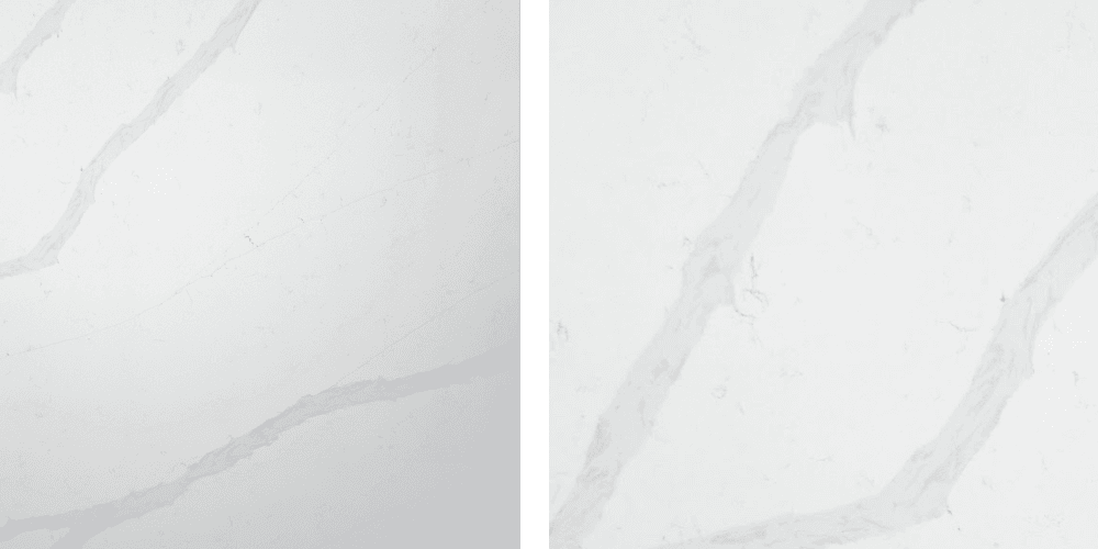 Calacatta Veil showcases a bright white canvas adorned with gentle gray waves and elegant, elongated gray veins. The harmonious interplay of color and pattern creates a tranquil and sophisticated atmosphere, making it an ideal choice for elevating your interior design, be it a modern kitchen, a serene bathroom, or a stylish commercial space.