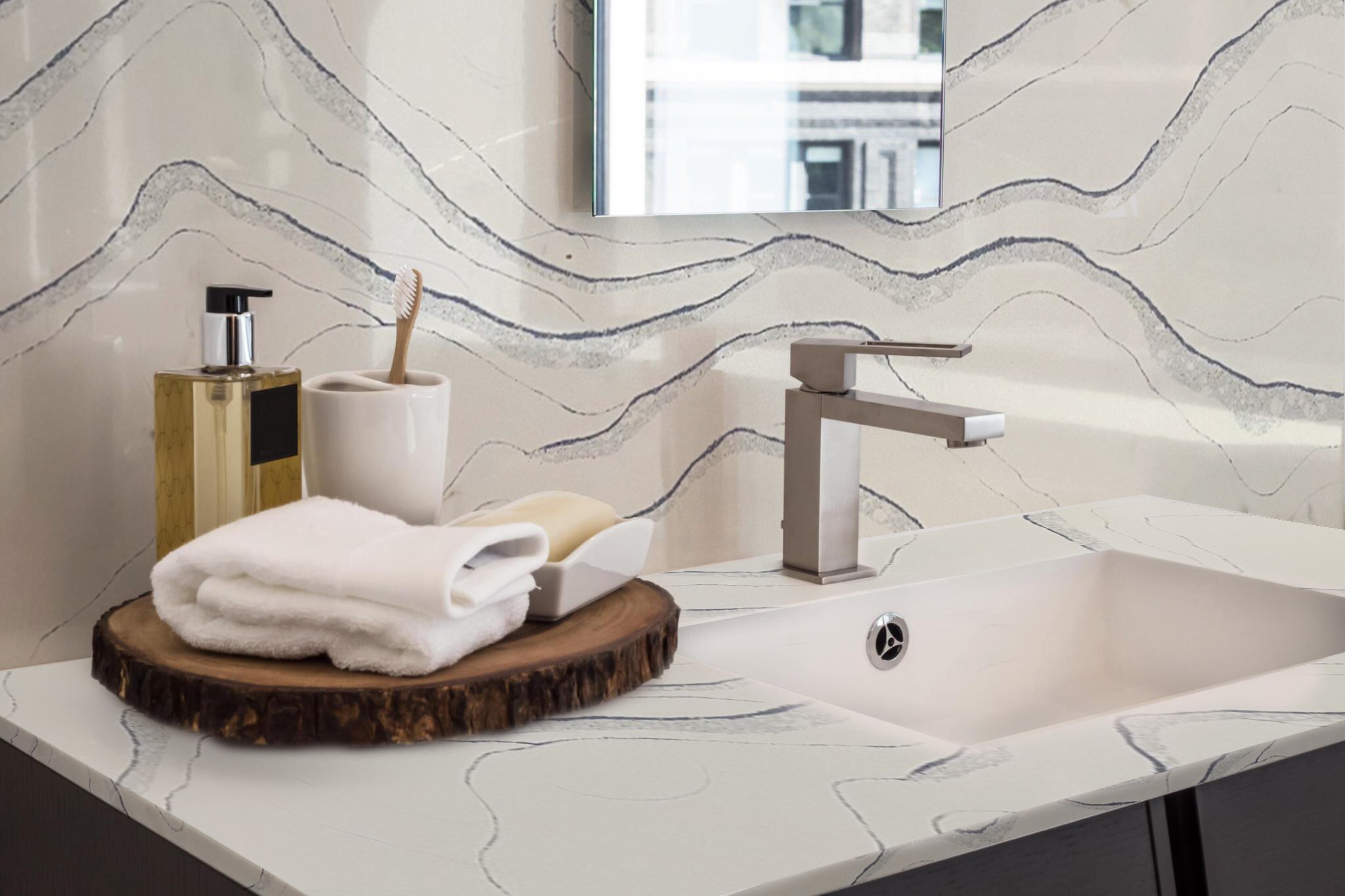 Tessa Stones quartz slabs offer versatility in their applications, suitable for enhancing the aesthetics and functionality of various spaces including bathrooms, kitchen countertops, backsplashes, dining table, fireplaces, bar counters and more. With their wide range of designs and durability, they elevate the ambiance of any room.